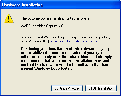 During the software installation, two or even more Windows Logo test warning messages will appear. Simply confirm them by clicking on the "Continue Anyway" button.