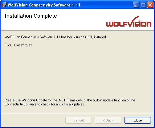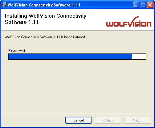 If you have already connected a WolfVision Visualizer to one of your computers USB ports before you started the installation of the software the USB cable has to be unplugged and replugged again in order to trigger the Windows operating system to install the appropriate USB device driver after the software was successfully installed. |