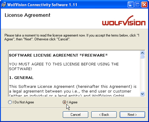 Read the software license agreement. When you agree with the license, click the "I Agree" button to proceed the installation. Otherwise click the "I Do Not Agree" button to abort the installation.
